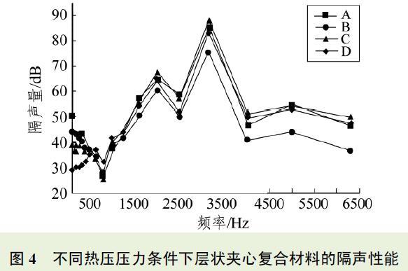 從圖4中可以看出,壓力3MPa時,試樣的隔聲性能相對較好,平均隔聲量為35.6dB。其原因是在此壓力條件下,密度板與阻尼材料緊密結合,夾心層不會因為壓力過大而產生變形。