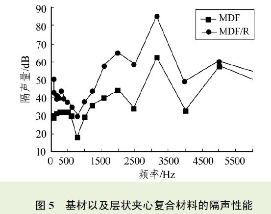 圖5結果表明,復合材料的隔聲性能優于同等厚度的單一的密度板。復合材料既擁有木質材料的優點,又彌補了木質材料隔聲性能差的不足。