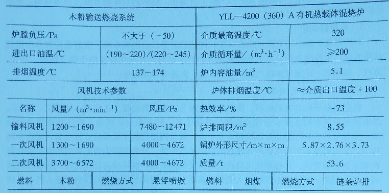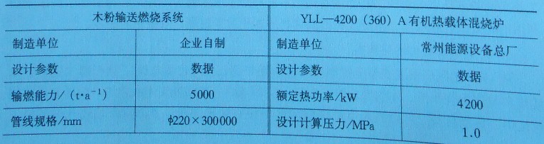 有機熱載體混燒爐于20世紀80年代初在我國誕生,是以煙煤、輕油、重油和燃氣為燃料,導熱油為熱載體,通過循環泵強制閉路液相循環將熱能輸送給用熱設備,然后返回 ‘ 加熱爐再加熱的直流式特種工業爐。其主要特點:①能在較低的運行壓力下,獲得340度以下的工作溫度,具有低壓高溫的技術特性;②可實現穩定的加熱和精確的溫度調節,滿足不同的工況要求;在熱負荷變化的場合,熱效率均能保持在較佳水平;③閉路循環,液相輸送熱能,熱損失少,節能效果顯著。所以,混燒爐被廣泛應用于各行各業,在林產工業系統主要用作熱壓和干燥,特別適合中小企業。近年來許多企業利用砂光粉和鋸屑作燃料,對有機熱載體混燒爐進行改造,應用效果不錯。黑龍江萬力木業有限公司根據企業的自身特點,在吸取國內外先進技術的基礎上,采用了木粉懸浮噴燃技術,對工廠型號為 YLL-4200A的有機熱載體混燒爐的燃燒方式進行技改,增設木粉輸送燃燒系統。在有機熱載體混燒爐內實現層(煤)懸(木粉)混合燃燒,取得了成效。有機熱載體混燒爐、木粉輸燃系統技術參數如表7-4所示。