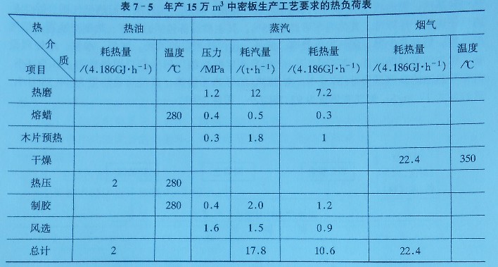 年產15萬m3纖維板生產工藝要求的熱負荷如表7-5所示。