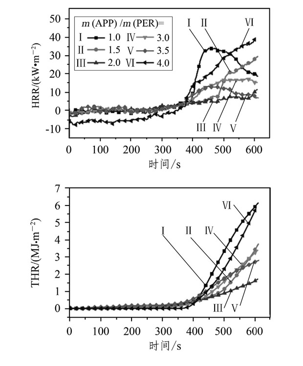 APP與PER按不同質量比制備的樹脂用于涂布MDF, 試樣的熱釋放速率 (HRR) 、熱釋放總量 (THR) 和質量損失率 (ML) 等測試結果見圖1和表1。