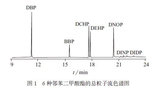 在1.4儀器工作條件下,對6種鄰苯二甲酸酯類化合物混合標準溶液進樣分析,以保留時間定性,分離效果見圖1。